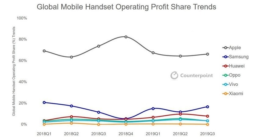 Cel mai nou studiu Counterpoint ne spune ceea ce bănuiam deja: Apple face un puhoi de bani din telefoane. Mai bine zis, 66% din toate profiturile întregii industrii în trimestrul 3 din 2019. Trebuie menţionat şi că Apple a obţinut doar 32% din veniturile totale, dar 66% din profituri. Asta pentru că au preţurile cele mai ridicate şi cel mai mare profit în comparaţie cu banii daţi pentru a produce un telefon.