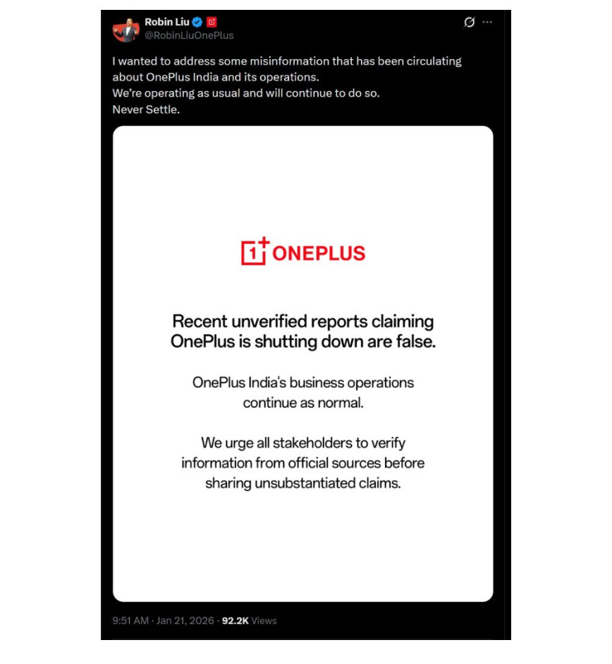 "Materialele recent publicate sunt neverificate şi afirmă că OnePlus se închide. Fals! Business-ul OnePlus India continuă ca de obicei. Recomandăm acţionarilor să îşi ia informaţii din surse oficiale."