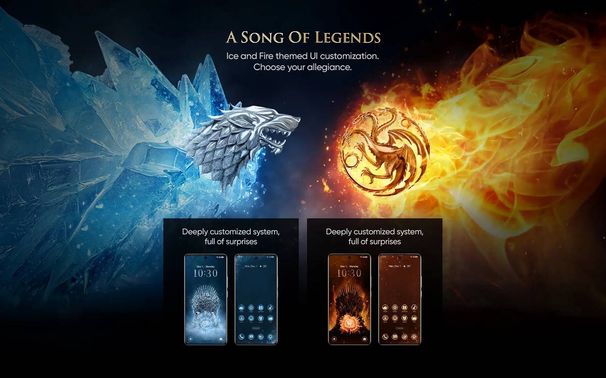 - Două teme UI personalizate pentru smartphone: una pentru fanii House Stark, cealaltă pentru echipa Targaryen.