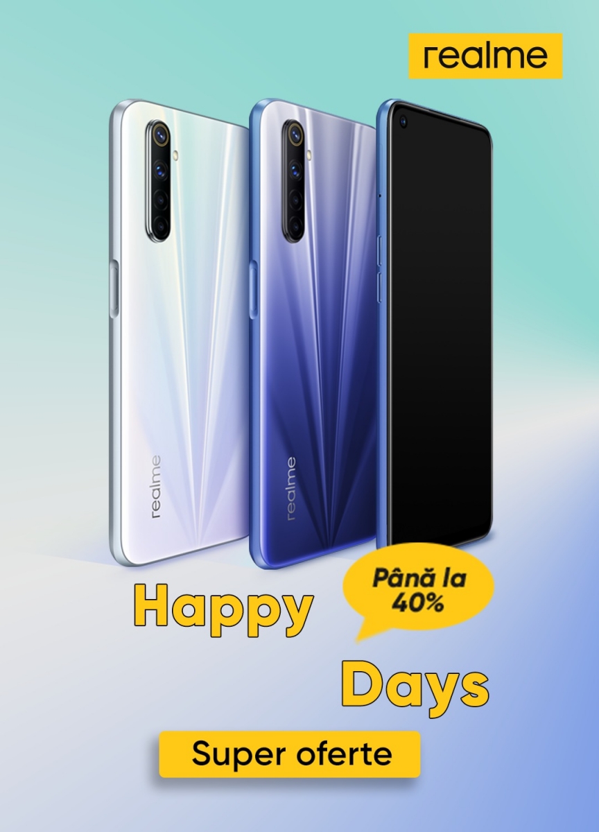 Realme ne anunţa astăzi că a debutat seria de oferte Happy Days, cu preţuri bune la o gamă variată de telefoane. Aceasta campanie se aplică la produsele vândute de eMAG, PC Garage, Cel şi evoMAG. Acolo găsiţi telefoane care dispun de reduceri considerabile, astfel încât veţi avea parte de cele mai noi dotări la preţ bun.