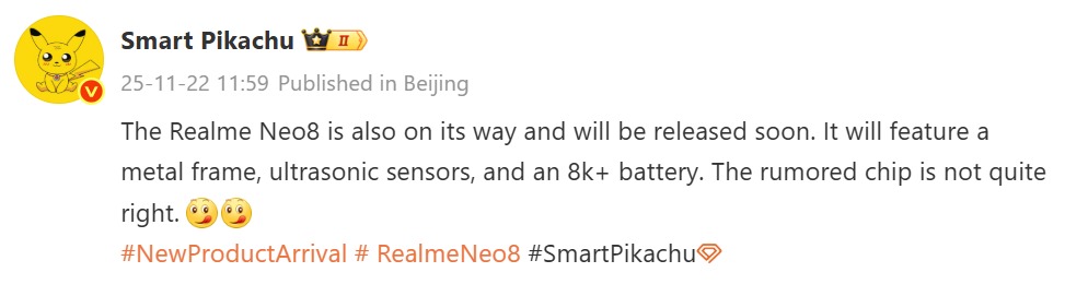 realme pregătește lansarea unui nou smartphone din gama „Neo”. Vorbim despre realme Neo 8, un model high-midrange ce pare să aibă un atuu important: o baterie de 8000 mAh. Informația vine de la Smart Pikachu, un tipster cunoscut în zona tech, ce activează pe weibo. Acesta mai spune că terminalul e „foarte aproape”de debut în China. Detalii avem mai jos.