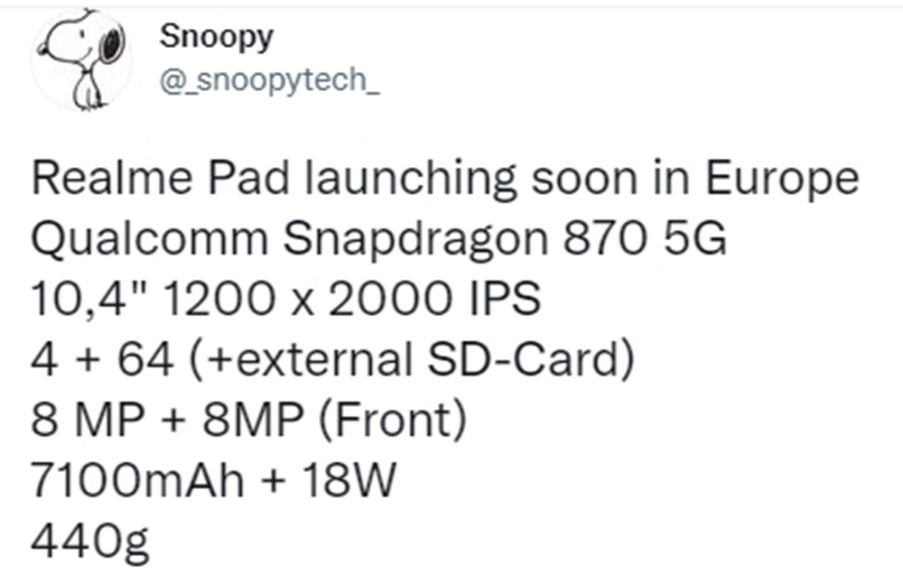 Potrivit zvonacului @_snoopytech_, realme Pad va debuta curând în Europa. El susține că la interiorul său se va afla însă un procesor Snapdragon 870 de la Qualcomm în locul cipsetului Helio G80 de la MediaTek. Totuși, chiar dacă vorbim despre un CPU foarte puternic, apropiat ca performanțe de cele ale unui flagship, tableta ar sosi doar cu 4 GB de memorie RAM și 64 GB de stocare potrivit zvonacului.