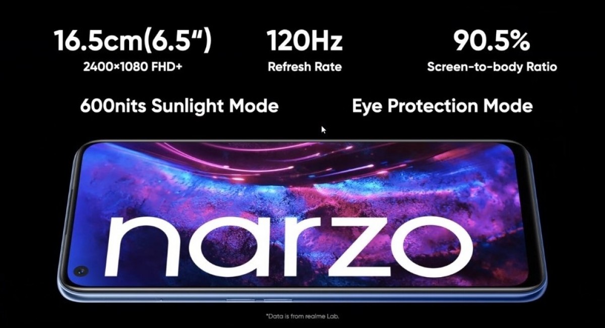 Narzo 30 Pro este primul telefon din seria Narzo cu suport 5G şi primul cu ecran cu refresh rate de 120 Hz. Este promovat ca un telefon de gaming, care vine cu procesor MediaTek Dimensity 800U şi un GPU Mali-G57 MC3. Aduce şi un ecran de 6.5 inch FullHD+ cu refresh rate de 120 Hz şi care face trecerea la 60 Hz automat dacă e cazul. Jocurile au parte de touch sampling rate de 180 Hz, iar panoul LCD promite până la 600 nits de luminozitate.