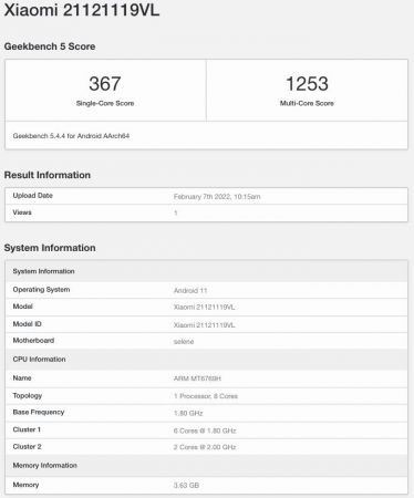 Redmi 10 (2022) este cunoscut după numărul de model 21121119VL. El obține în GeekBench 367 de puncte în testul single-core și 1253 de puncte în cel multi-core. Se pare că la interior se află un procesor MediaTek MT6769H (Helio G88). Totodată, aflăm că în cazul modelului testat există și 4 GB de memorie RAM, iar el rulează Android 11 ca sistem de operare din fabrică.