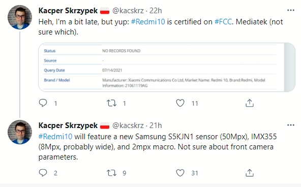 În plus, un zvonac de pe Twitter numit Kacper Skrypek a dezvăluit detalii importante legate de camera foto a terminalului. El susține că Redmi 10 va avea un senzor de 50 MP principal în spate. Acesta ar fi Samsung S5KJN1 (cunoscut și drept ISOCELL JN1). Se pare că vor fi trei camere în spate, setup-ul fiind format dintr-un senzor de 50 MP principal, unul de 8 MP Wide și unul de 2 MP Macro. Pe hârtie Redmi 10 ar urma deci să aibă o cameră decentă pentru un midrange.