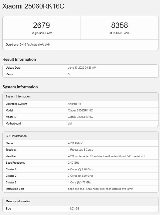 Începem cu scorurile, de 2679 puncte single-core și 8358 puncte multi-core, fiind la nivelul unui fost flagship. Are procesor octa-core MediaTek Dimensity 9400+ și în configurația testată aici are 16 GB RAM. Procesorul include 1x nucleu Prime de 3.73 GHz, 3x nuclee de performanță de 3.30 GHz și 4x nuclee de eficiență energetică la 2.40 GHz.