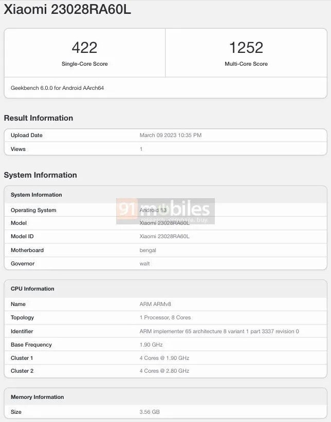 Ce ne dezvăluie acest benchmark? Faptul că Redmi Note 12 4G (23028RA60L) vine cu procesor octa-core de 1.9 Ghz, aparent un Qualcomm Snapdragon 680 care aduce și GPU Adreno 610. Obține 422 puncte la testul single-core, respectiv 1252 puncte la testul multi-core.