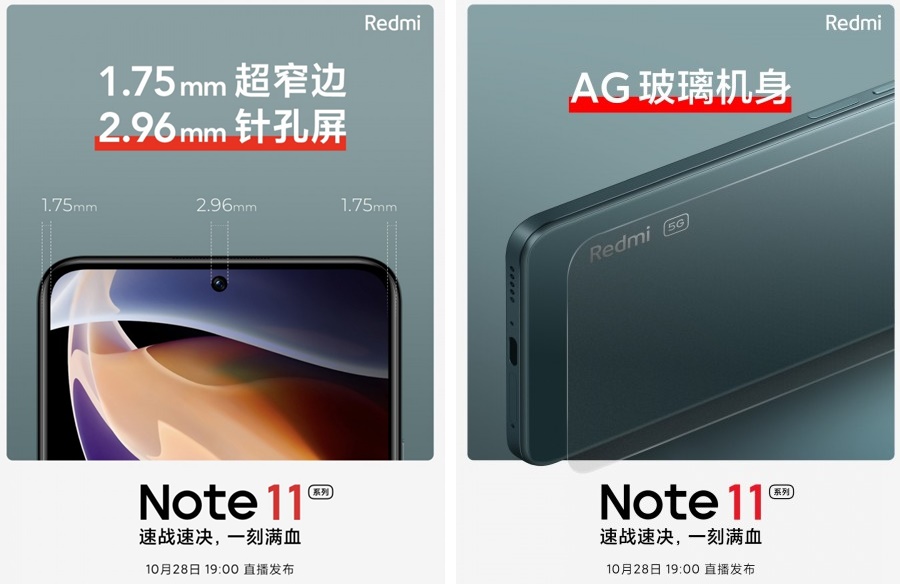 Începem cu Note 11, smartphone pe care îl așteptăm cu ecran AMOLED plat și după cum indică și teaserele de mai sus, cu sticlă de protecție AG Glass pentru panoul din spate, fiind rezistentă la zgârieturi și protejând de amprente. Ecranul va avea un decupaj selfie de doar 2.96 mm în diametru, iar muchiile din jurul ecranului (stânga și dreapta), măsoară fiecare doar 1.75 mm.