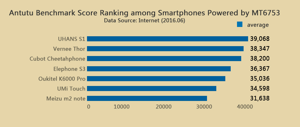 Ei bine, aflați că UHANS S1 obține un scor de 39.068 puncte - fiind astfel cel mai puternic model dintre telefoanele ce adoptă un chip MediaTek MT6753. Sub acesta se află terminale ca Vernee Thor la mică distanță, dar și Elephone S3, sau Oukitel K6000 Pro. Un detaliu mai interesant este acela că punctajul lui S1 este chiar mai bun decât cel obținut de Samsung Galaxy A5 (2016) - 37.517 puncte.