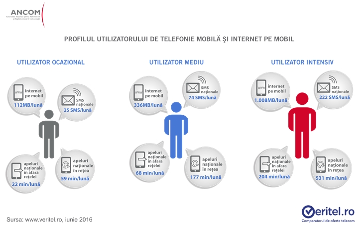 Utilizatorul ocazional consumă 112 MB trafic Internet pe mobil, în creştere faţă de cei 56 MB ai perioadei trecute, trimite 25 de SMS-uri şi apelează 81 de minute. În cele din urmă, utilizatorul intensiv consumă 1 GB Internet pe lună, faţă de 501 MB în perioada de raportare precedentă, trimite 222 SMS-uri şi apelează 735 de minute.