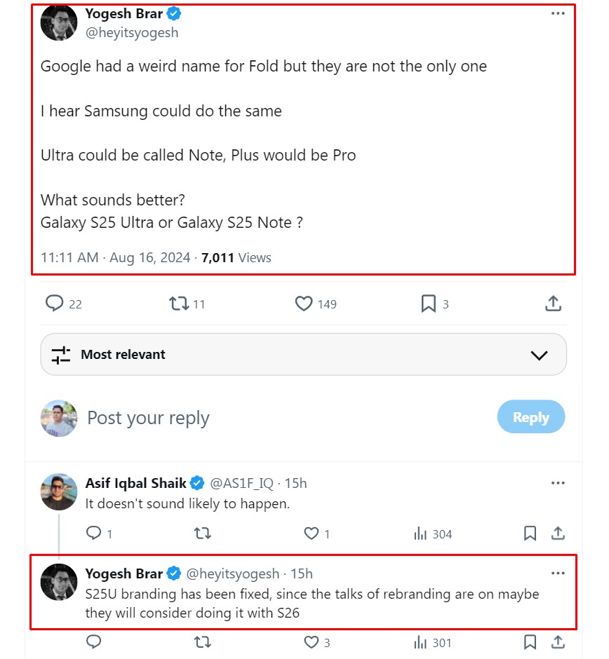 Tipster-ul a făcut o postare pe x.com în care explică că seria Galaxy S25 ar putea aduce această schimbare. Totuși, ulterior a dezvăluit că abia în 2026, odată cu Galaxy S26, ar putea interveni schimbări. Se pare că așa-zisul Galaxy S26 Ultra ar putea deveni „Galaxy S26 Note”, iar Galaxy S26 Plus ar putea fi prezentat drept „Galaxy S26 Pro”.