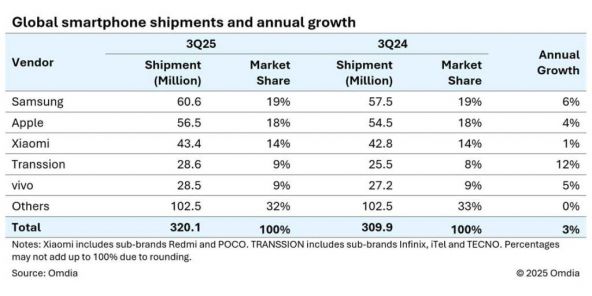 Samsung a reușit din nou să se mențină pe prima poziție în topul global al livrărilor de smartphone-uri. Potrivit unui nou raport Omdia, compania sud-coreeană a vândut cu 6% mai multa unități în al treilea trimestru din 2025, față de aceeași perioadă a anului trecut. Gigantul a livrat 60.6 milioane de telefoane în acest trimestru, comparativ cu 57.5 milioane în aceeași perioadă din 2024. Mai jos avem detalii!