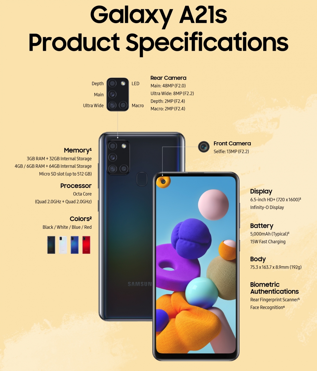 Samsung Galaxy A21s sosește pe negru, alb, albastru sau roșu la un preț de 200 euro și va fi disponibil din 19 iunie.
