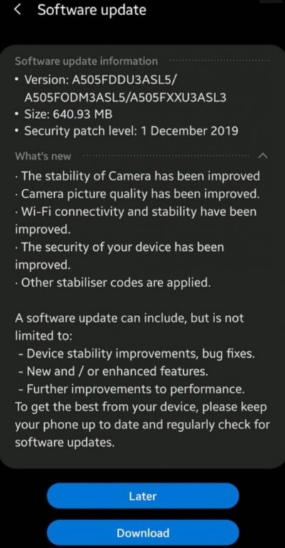 Noul software aduce şi Security Patch-ul pe luna decembrie 2019 şi ocupa 640 MB. Avem şi stabilitate WiFi îmbunătăţită şi o funcţie Smart Capture. Deocamdată actualizarea a fost confirmată doar în India şi are versiunea de build "A505FDDU3ASL5". Changelog-ul menţionează o îmbunătăţire a stabilităţii camerei şi a calităţii fotografiilor. Vine şi funcţia nouă Smart Capture la pachet, care îi permite utilizatorului să facă nişte capturi de ecran mai lungi, să ia notiţe pe el şi să le partajeze direct din Gallery.