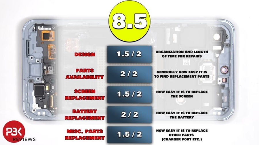 Scorul de reparabilitate obținut este de 8.5 din 10. Pierde câteva puncte la capitolul design interior pentru o organizare nu tocmai perfectă, iar display-ul necesită puțină atenție atunci când este înlocuit, fiind destul de greu de accesat. Pare că sunt ușor de înlocuit și componente precum camera, port USB-C. Interesant e să vedem și o zonă de răcire cu Vapor Chamber generoasă pe acest model.