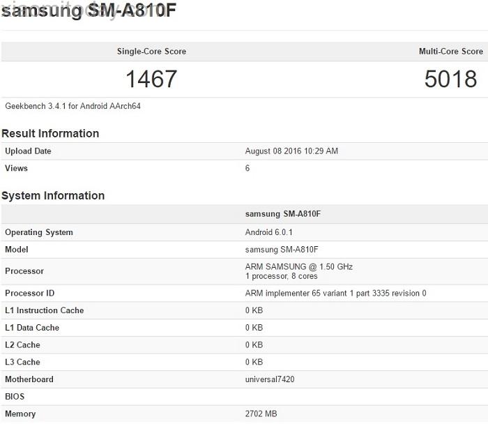 Ei bine, acest CPU se va afla într-adevăr pe noul Galaxy A8 ediția 2016, dotarea fiind confirmată acum și de către GeekBench. Din listarea cu pricina afișată mai sus aflăm că procesorul adoptă 8 nuclee tactate la o frecvență de 1.59 GHz, și faptul că avem 3 GB memorie RAM la dispoziție.