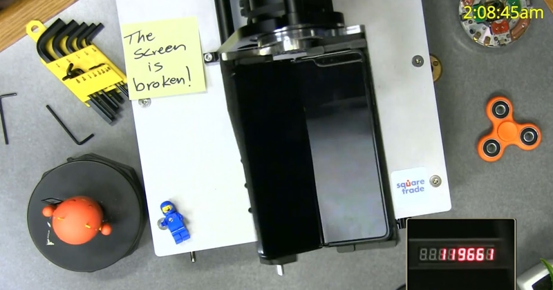 Şi cine altcineva decât un expert în garanţii să ştie exact cât rezistă un telefon de 2000 de euro? CNET a împrumutat aparatul de test de la ei şi a pus un Galaxy Fold la treabă. Testul a fost făcut live, pe YouTube şi abia pe la 120.000 de îndoiri a apărut o uşoară deteriorare a balamalei. E drept că apăruse şi o "gâlmă" cât un pixel la 18.500 de îndoiri.