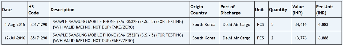 Ca de obicei site-ul indian de import/export Zauba ne oferă indicii de genul, iar telefonul în cauză are numele de cod SM-G532F şi ar urma să fie un Samsung Galaxy Grand Prime (2016). Vine cu un ecran de 5 inch, iar faptul ca are nume de cod SM-G532F se aliniază perfect cu identitatea sa, deoarece primul Galaxy Grand Prime era SM-G531.