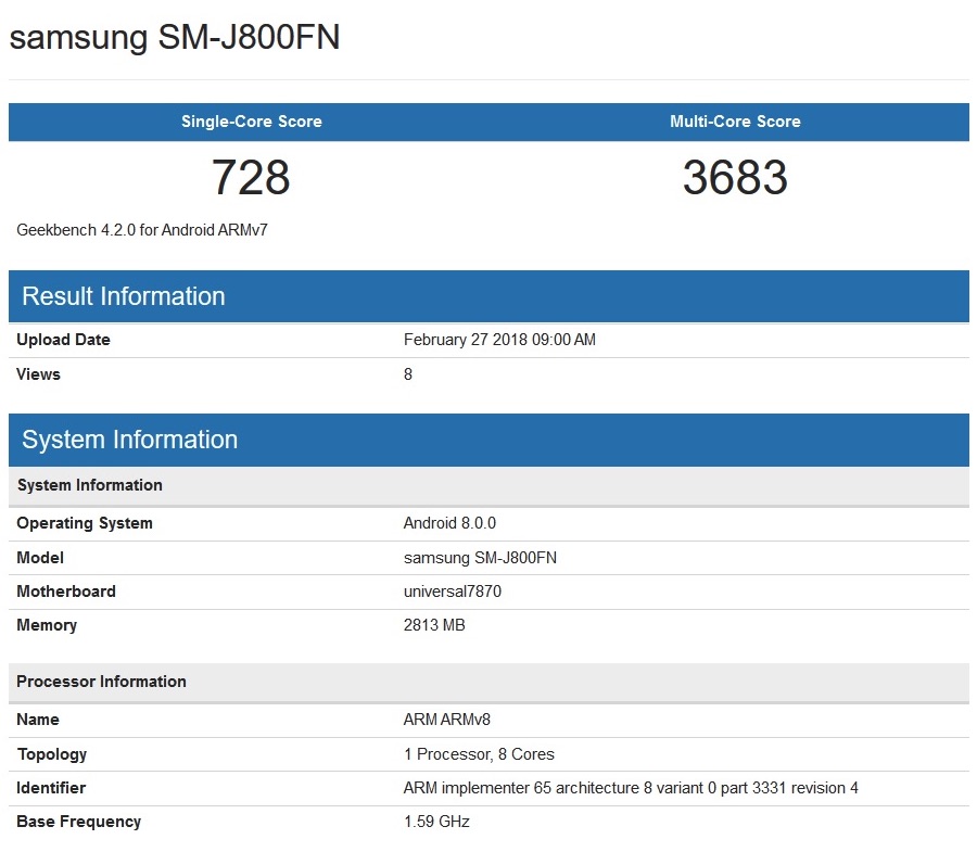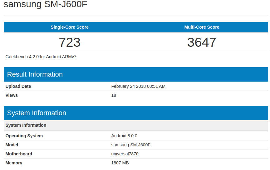 Samsung SM-J337P/SM-J337A şi SM-J600F au fost numele de cod depistate în GeekBench, acestea fiind Samsung Galaxy J3 (2018) şi Samsung Galaxy J6. Ambele rulează Android 8.0 Oreo şi au 2 GB RAM la bord. J3 (2018) ar urma să vină cu un procesor Exynos 7570 de 14 nm, iar Galaxy J6 (2018) trece la un Exynos 7870, care se află deja pe câteva modele midrange Samsung şi e destul de puternic (îl găsim pe Galaxy J5 şi J7 (2017)).