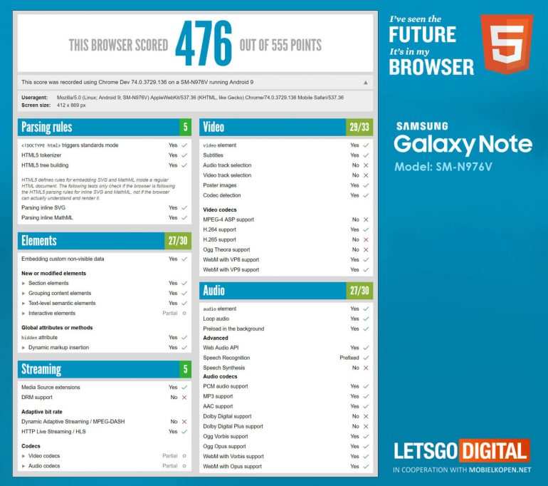 Viitorul telefon Note ar trebui să debuteze în intervalul august-septembrie. Galaxy Note 10 Pro 5G ar fi apărut deja în benchmark-uri, cu numele de cod SM-N976V, dezvăluind câteva detalii despre aspect ratio-ul său. E vorba despre un HTMLTest, găsit de către un site olandez. Telefonul apare cu Android 9.0 Pie la bord şi o rezoluţie de 412 x 869 pixeli.
