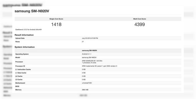 Samsung Galaxy Note 5 tocmai a apărut în benchmarkul GeekBench, în varianta pentru operatorul Verizon, sub numele de cod SM-N920V. Terminalul se remarcă aici prin faptul că vine cu 4 GB RAM la bord şi un procesor Exynos 7420.