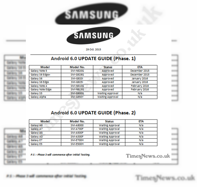 Remarcăm faptul că primele două smartphone-uri ce se vor bucura de Android 6.0 Marshmallow, sunt nimeni altele decât Galaxy Note 5 (SM-N920G), și Galaxy S6 Edge+ (SM-G928G), modele lansate în august. Pachetul software Android 6.0 Marshmallow va sosi în cursul lunii decembrie, fără a fi dezvăluită o dată precisă.