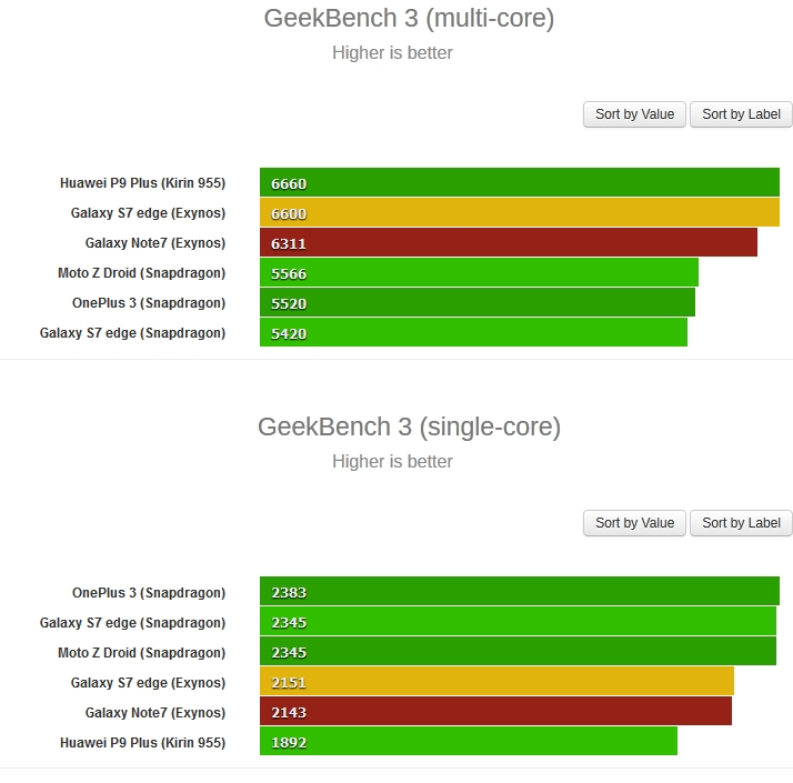 În GeekBench 3, în sub-testul multi core Galaxy Note 7 a fost chiar sub Galaxy S7 Edge, în varianta Exynos, dar şi sub Huawei P9 Plus, plus a depăşit OnePlus 3 şi varianta Snapdragon de Galaxy S7 Edge. Intre timp în sub-testul single core a fost sub OnePlus 3, S7 Edge Snapdragon şi Moto Z Droid. GFXBench a adus un scor cu mult peste Huawei P9 Plus (aproape triplu) în testul Manhattan 1080p offscreen, dar în acelaşi timp sub Galaxy S7 Edge Snapdragon şi OnePlus 3.
