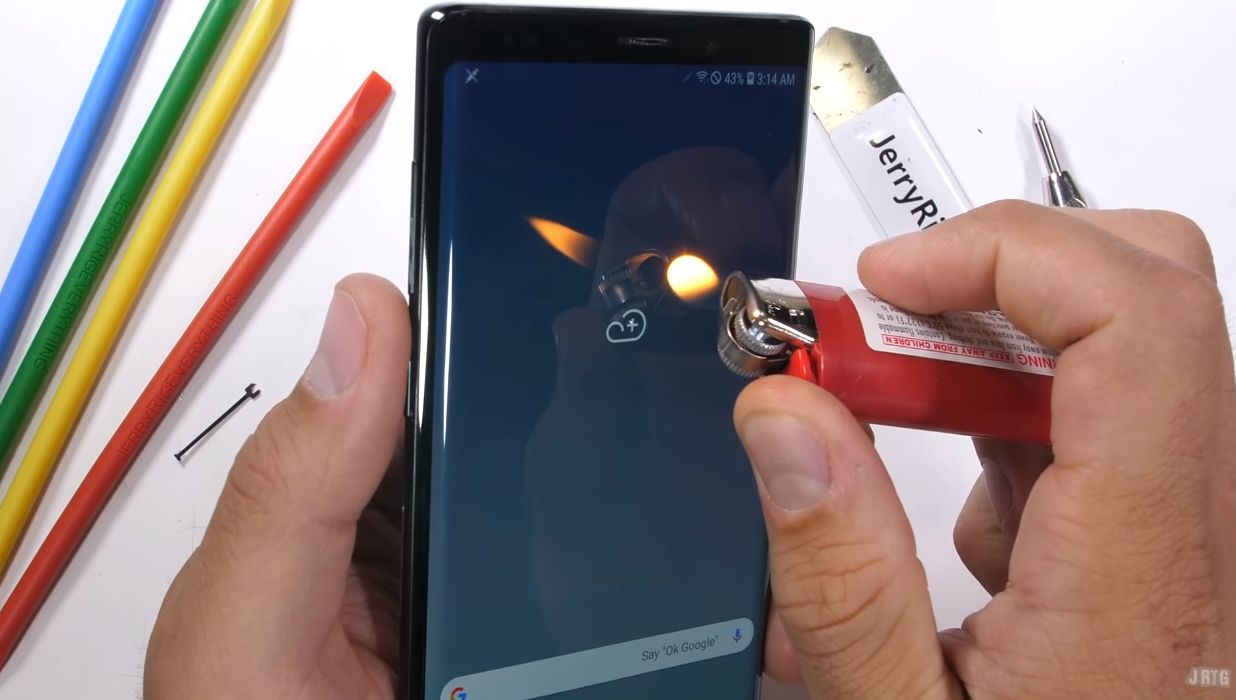 Revenind la Galaxy Note 9, a venit apoi şi restul cu bricheta, iar panoul Super AMOLED de 6.4 inch a rezistat 15 secunde la flamă, devenind apoi alb şi revenindu-şi rapid. A trecut şi el cu brio deci testul. La final a venit celebrul test de îndoire, iar Galaxy Note 9 nici măcar nu se clinteşte, deci e super rezistent. Nu se îndoaie, nu cedează, nu crapă. Rămâne să vedem dacă acea problemă cu butoanele va da naştere doar la farse sau şi la necazuri pentru utilizatorul de rând.