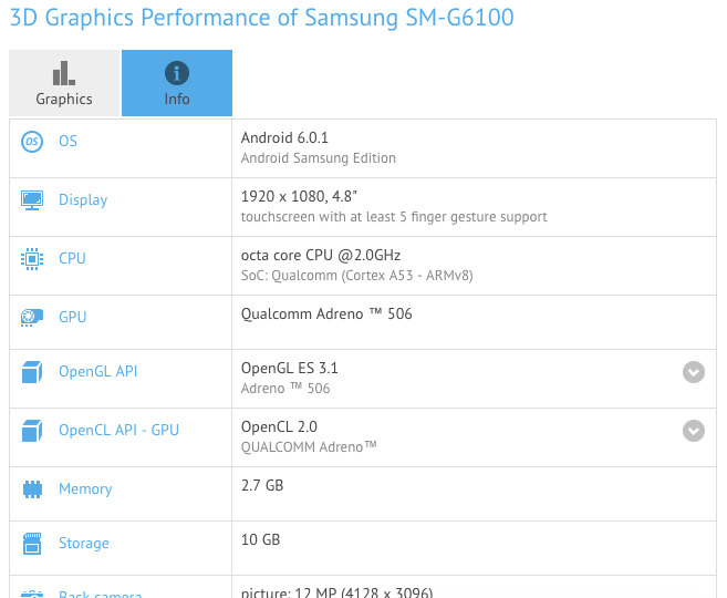 El dezvăluie dotările terminalului, care ar fi apărut şi într-o bază de date din India, sub numele de cod SM-G600F. Revenind la benchmark, el dezvăluie faptul că terminalul va avea un ecran Full HD de 4.8 inch, un procesor Qualcomm Snapdragon 625 octa core de 2 GHz, 3 GB RAM, 16 GB stocare şi că va rula cea mai nouă versiune de Android 6.0 Marshmallow cu TouchWiz aplicat peste.
