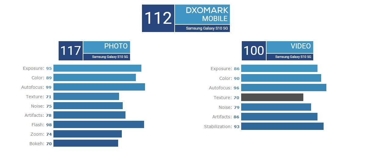 Se descurcă foarte bine în scenele cu contrast crescut şi este superior lui Huawei P30 Pro la culori. DxO a realizat chiar o comparaţie cu Huawei P30 Pro, iar S10 5G obţine culori mai bine calibrate şi mai neutre, în vreme ce P30 Pro la acea captură cu castelul are o uşoară nuanţă cyan pentru cer şi ceva verde la clădire, iar florile sunt mai puţin vii. Autofocalizarea telefonului Samsung este aproape perfectă, cu 99 de puncte, indiferent de condiţiile de iluminare.