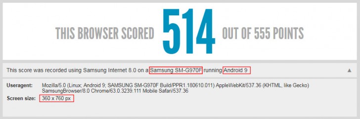 În cazul de față avem de-a cu teste din cadrul HTML5 unde descoperim pentru început modelul Galaxy S10 Lite (SM-G970F) care rulează Android 9.0 Pie din fabrică și care are un ecran cu mărime de 760 x 360 pixeli și care se traduce într-o rezoluție Full HD+ de 2280 x 1080 pixeli. Avem un panou cu aspect 19:9 și un decupaj circular în ecran pentru camera selfie.