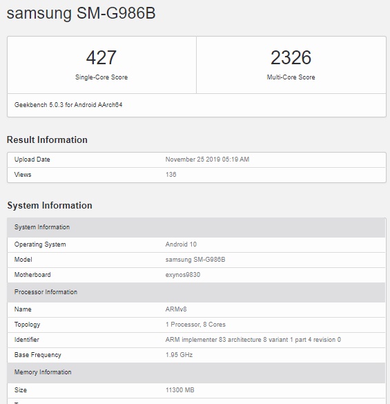 Astfel, comparațiile cu rezultatele obținute de alte telefoane în GeekBench 4 nu pot avea loc din cauza acestor schimbări. Revenind la subiectul central, aflăm că această variantă S11 5G apare aici sub numele de serie SM-G986B, având la pachet procesor octa-core Exynos 9830 a.k.a Exynos 990 și 12 GB de RAM. Rulează din fabrică Android 10 alături de interfața One UI 2.0.