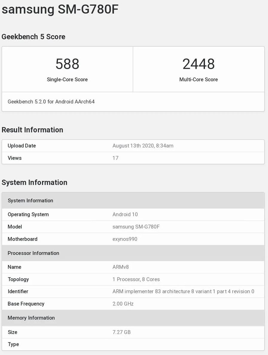 Informaţia provine de la o listare în GeekBench a acestui terminal, dar o privim cu precauţie, pentru că e uşor de falsificat. Samsung Galaxy S20 FE apare cu numele de cod SM-G870F aici, având un procesor Exynos 990 la bord. Benchmark-ul dezvăluie şi că terminalul are 8 GB RAM la bord, iar scorul sau Multi Core e doar cu 300 de puncte sub cel de la Galaxy Note 20 Ultra, apropo.