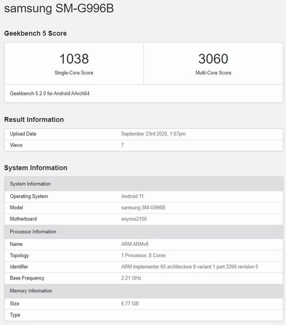 Procesorul apare cu 8 nuclee, dar nu ştim cum sunt ele organizate. E posibil să fie acel setup 1+3+4 despre care am scris recent pentru Exynos 1000. E vorba despre un nucleu principal, 3 pentru performanță şi 4 pentru eficienţa energetică. Cipsetul pare a avea o frecvenţă de bază de 2.21 GHz şi e însoţit de 8 GB RAM. Apare şi Android 11, iar Galaxy S21 a obţinut 1038 de puncte în testul single core şi 3060 în cel Multi Core.