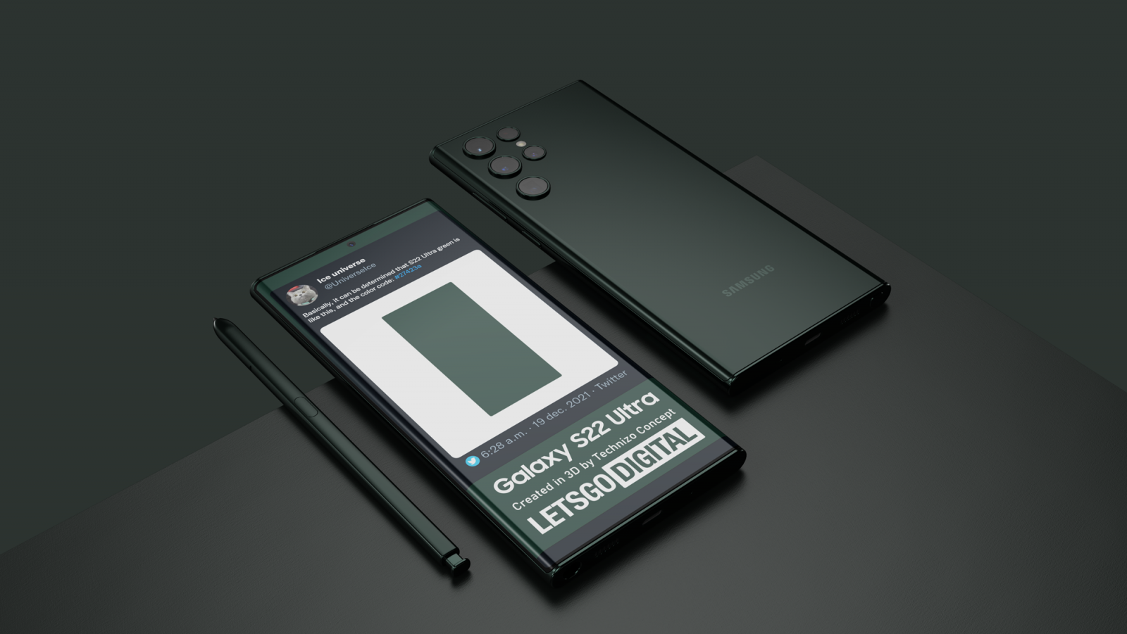 Seria de smartphone-uri Samsung Galaxy S22 continuă să bifeze leak-uri în mediul online, iar astăzi apare o veste proaspătă referitoare la variantele de culoare în care va sosi modelul Ultra/Note. Dacă în materialul anterior eram informați că acest model va sosi pe roșu, negru sau alb, iată că acum apare în peisaj o nouă nuanță, una elegantă și având codul de culoare #27423a, potrivit celebrului zvonac Universe Ice.