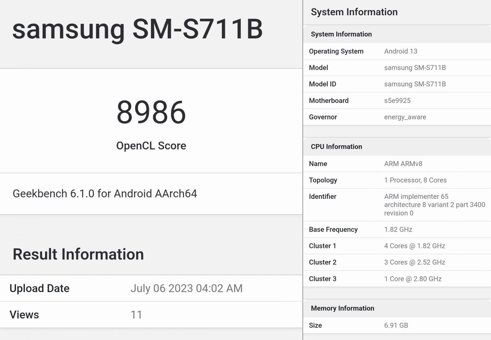 Samsung Galaxy S23 FE apare în Geekbench având asociat numărul de model SM-S711B și are un procesor Exynos 2200 și 8 GB de memorie RAM în interior. De asemenea, rulează Android 13. Testul prezintă doar scorul obținut de GPU și anume 8986 de puncte.