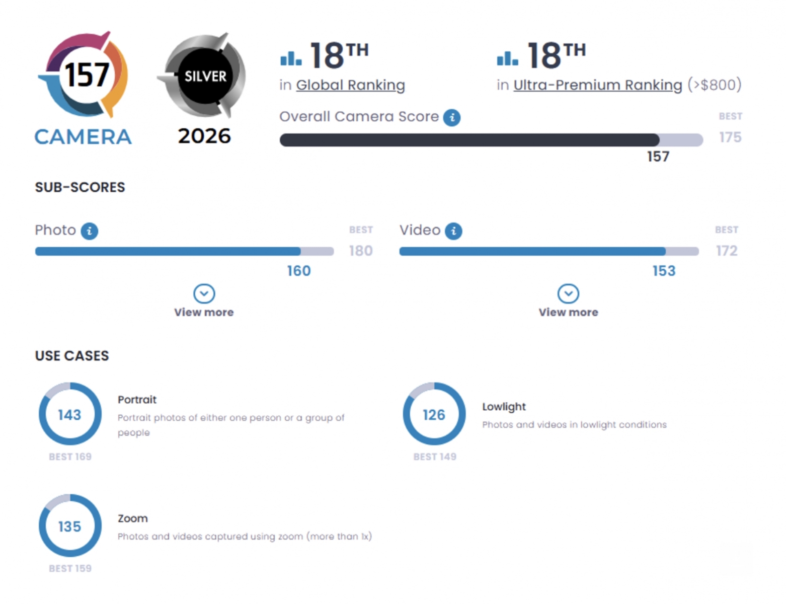 E drept şi că urcă scorul faţă de predecesor cu 6 puncte, ajungând la un total de 157. A primit 160 de puncte la foto şi 153 la video. Recorduri sunt la Bokeh, cu 165 din maximul de 180 şi la ultrawide pe video, cu 144 din 151. Mă miră punctajul de la telephoto, doar 141 din maximul de 170. Nici în low light nu mă dă pe spate scorul de 126 din maximul de 149.