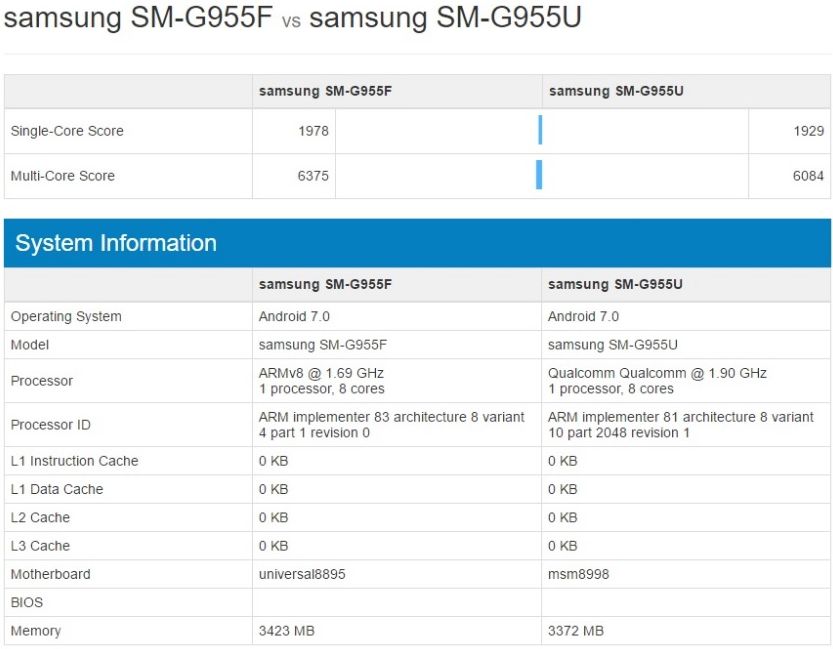 Aparent chipul Qualcomm are latența memoriei ridicată în ambele teste şi rămâne de văzut dacă experiența utilizatorului va fi afectată sau nu. Cel mai probabil nu, dacă memoria este administrată cum trebuie. Are loc şi o comparaţie cu Galaxy S7 Edge, Exynos 8895 fiind net superior lui Exynos 8890, mai ales la testul multi-core. Îmbunătăţiri ar fi fost aduse de către inginerii Samsung la capitole precum detectare facială, recunoaştere a comenzilor vocale şi procesare HDR, toate funcţii intens utilizate de pe terminalele moderne.