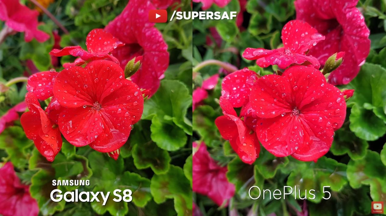 La selfie OnePlus 5 face imaginea cam gălbuie, dar prinde mai multe detalii, mulţumită rezoluţiei ridicate. În privinţa capturii foto cu camera principală, Galaxy S8 are culori mai vii, dar la claritate şi detalii ambele stau bine, imposibil de separat. Fotografia macro e foarte apropiată, iarăşi culorile fiind de partea S8. Modul Portrait face fotografiile să arate excelent pe OnePlus 5 cu efectul Bokeh, în vreme ce S8 se mulţumeşte cu Selective Focus.