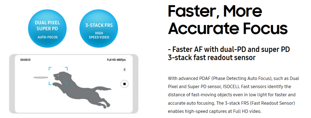 Samsung a creat un nou senzor ISOCELL Bright, un model 3 Stack Fast Readout, capabil de filmare de acest tip. Marea întrebare e cât durează captura. În cazul lui Sony Motion Eye putem ajunge la 960 FPS pentru o cincime de secundă şi la rezoluţie 720p doar. Cert e că noua cameră Dual Pixel e clar o evoluţie faţă de filmarea slow mo actuală de pe Note 8 şi S8, adică 240 FPS/720p.