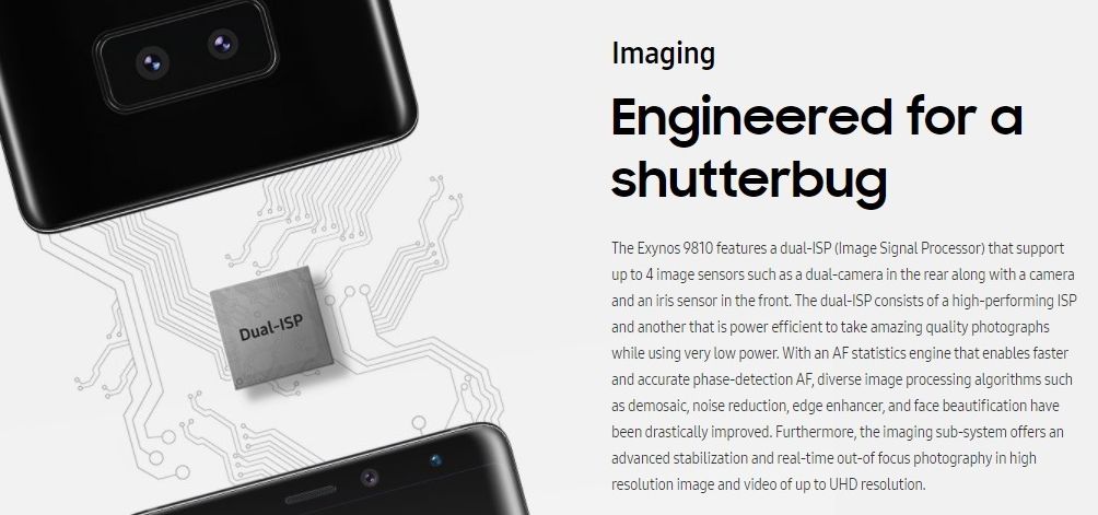 S9 cel mic va păstra abordarea single camera, dar S9+ trece la o cameră duală care ar trebui să îi fie superioară şi celei apreciate de pe Galaxy Note 8. De această dată în sistem se va implica şi AI-ul , iar noul procesor flagship Exynos 9810 va aduce la pachet un dual ISP, pentru procesarea de imagini la nivel avansat. Procesorul de semnal de imagine suporta până la 4 senzori, adică două camere în faţă şi două în spate.