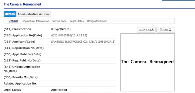 Samsung a înregistrat un nou trademark în Coreea de Sud, de această dată pentru expresia "The Camera. Reimagined". Aceasta sintagmă ar putea fi un motto care va însoţi debutul lui Samsung Galaxy S9 în următoarea perioadă și care ar putea ajunge pe materialele promoţionale pentru noul flagship.