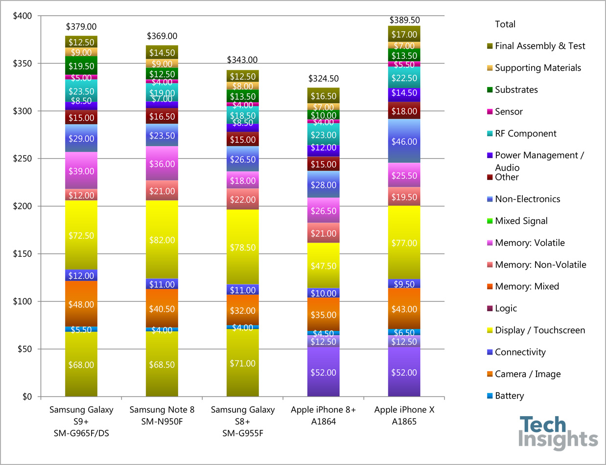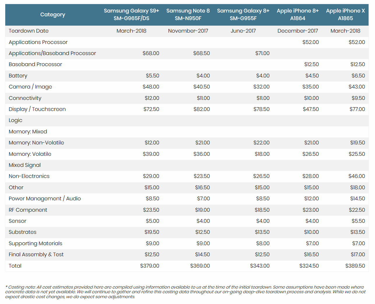 iPhone X e cel mai scump smartphone de produs, la 389.5 dolari, în vreme ce iPhone 8 Plus costă 324.5 dolari. Trebuie spus şi că Samsung îşi produce singura majoritatea componentelor de pe telefoanele sale, iar banii daţi pe ele se duc la filialele sale, deci nu ar trebui să fie calculate ca un "cost". Apple în schimb plăteşte terţe părţi. Ca de obicei sunt lăsate pe afară costuri precum cele de R&D, marketing, ambalare, livrare şi dezvoltare software.