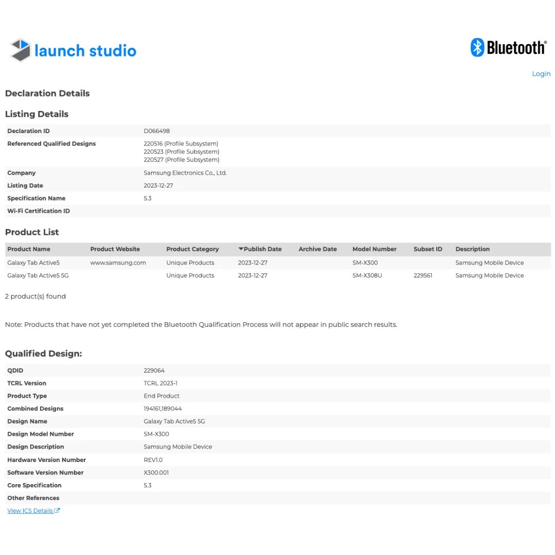 Pentru început descoperim că noua tabletă va sosi în două versiuni, Wi-Fi Only și 5G, ambele fiind listate în baza de date Bluetooth SIG, semn că lansarea este aproape. Tableta apare sub diferite nume de serie precum SM-X300 (varianta Wi-Fi globală) sau SM-X306B (5G global). Mai sunt și modelele SM-X306N, SM-X308B, SM-X308B pentru alte regiuni.