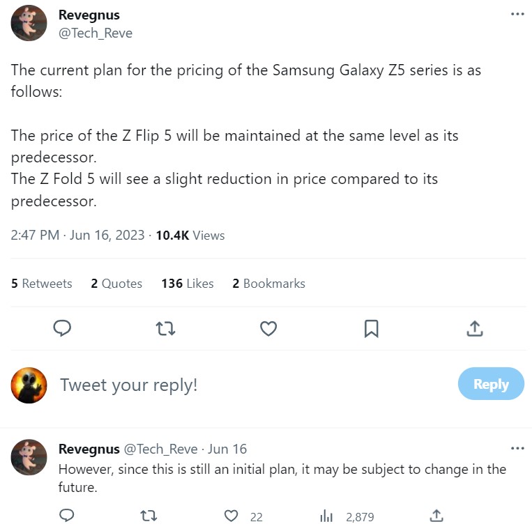 Conform tipster-ului Revegnus (Twitter), prețul lui Galaxy Z Flip 5 va fi păstrat la același nivel cu al predecesorului. Sunt vești bune, având în vedere că pliabilul cu clapetă va avea un display extern mai mare și va sosi cu upgrade-uri la nivel de hardware. Pe de altă parte, aflăm că Galaxy Z Fold 5 va sosi la un preț mai mic față de precesor.