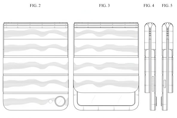 Conform schițelor atașate brevetului, telefonul nu are un ecran extern dedicat. Atunci când telefonul e pliat spre interior, o parte a panoului rămâne vizibilă, pentru a afișa notificări. Un alt lucru observat este simetria perfectă. Terminalul arată identic, neavând o „față” clară sau un spate definit, ceea ce continuă ideea unui design reversibil. Apare aici și un decupaj circular misterior, prezent pe una dintre fețele externe, posibil pentru camera selfie a telefonului.