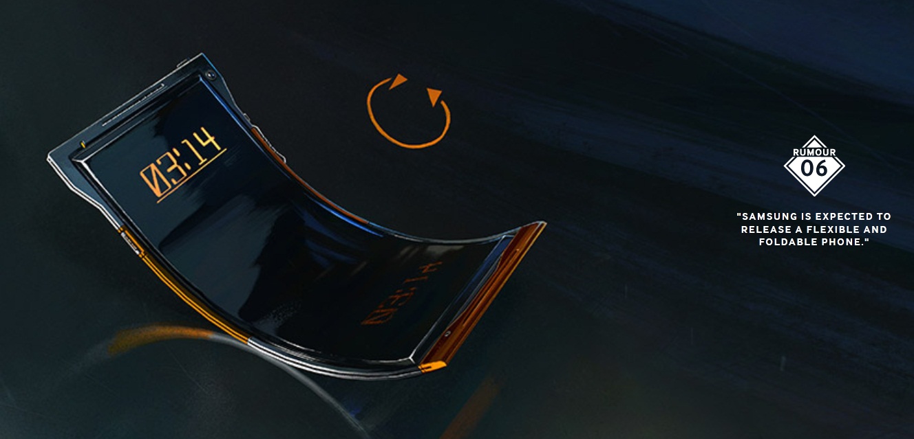 Apoi vedem şi un terminal cu ecran care se poate extinde, aluzie la faptul că S6 va avea un ecran mai mare. În cele din urmă se discută despre corpul din sticlă, fiind prezentat un telefon transparent fabricat complet din sticlă şi care aduce cu o telecomandă de Nintendo Wii. Apoi vedem şi cireaşă de pe tort: un telefon flexibil şi rulabil, care în mod sigur nu va sosi la MWC 2015.
