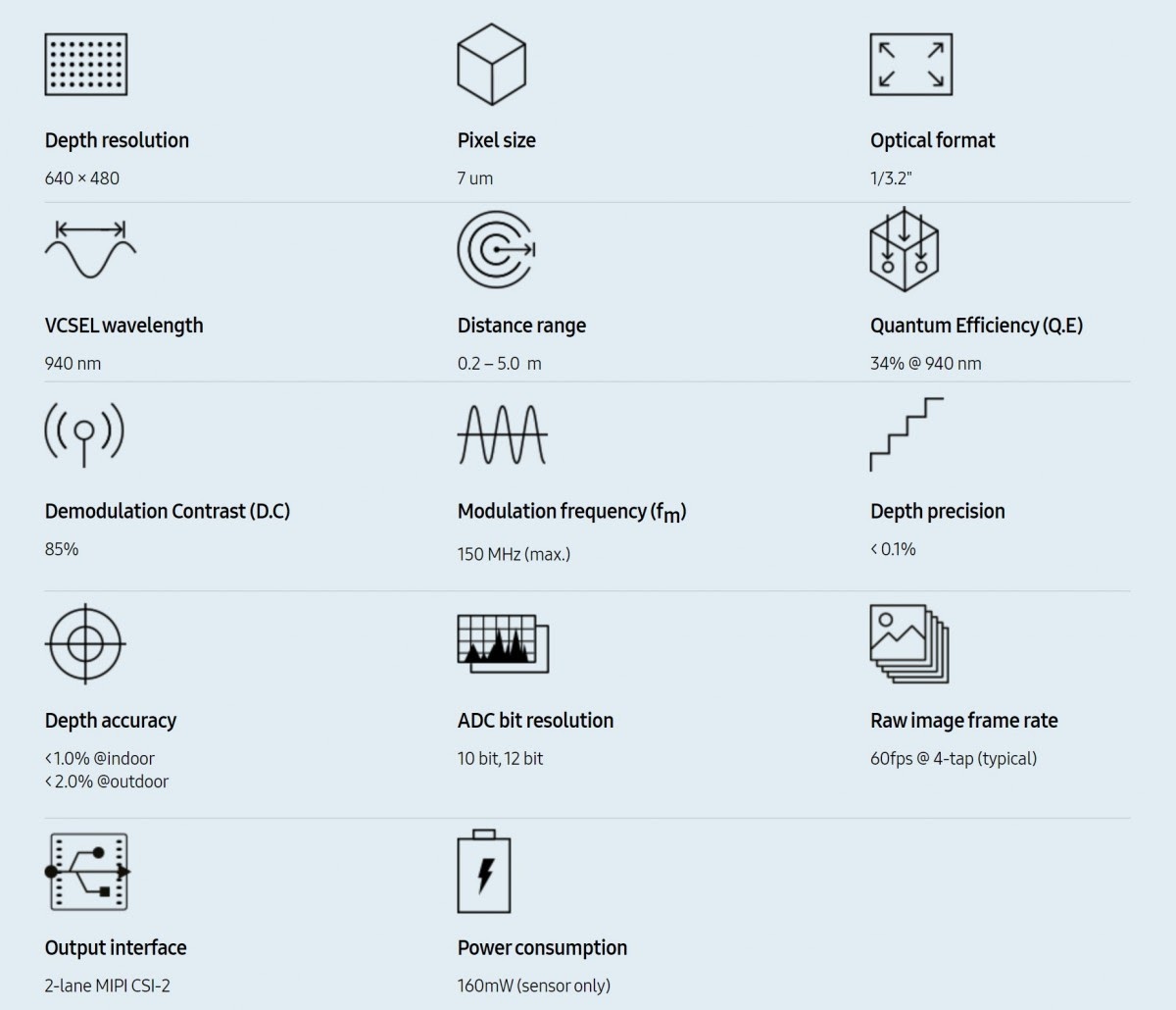 E vorba despre noul senzor Samsung ISOCELL Vizion 33D, care oferă funcţie de tracking pentru obiectele care se mişcă rapid. Vă ajuta mult la o autofocalizare mai rapidă şi la Bokeh Video. Noul senzor va crea hărţi ale adâncimii cu rezoluţie de 640 x 480 pixeli. Poate măsura distanţe cuprinse între 0.2 m şi 5 metri, cu rezoluţii 10 sau 12 bit. Atunci când este folosit pentru a ajuta autofocalizarea, acest senzor necesită 200mW de energie, pentru sarcinile sale, dar şi iluminarea infraroşu.