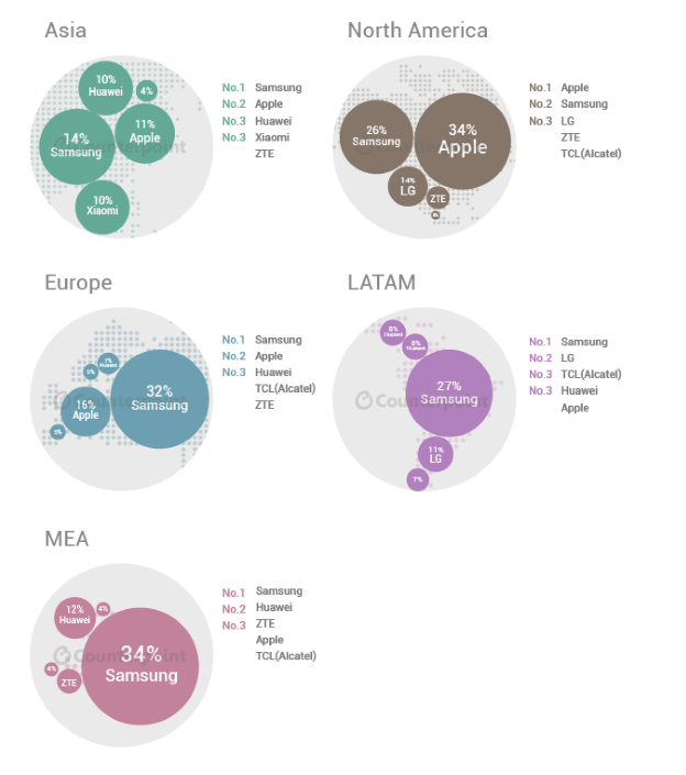 Samsung rămâne lider nu doar global, ci şi pe majoritatea continentelor. Totuşi, în America de Nord Apple domina, cu o cotă de 31%, iar Samsung e pe locul 2, cu 24%, în vreme ce LG are o cotă de 15%. ZTE e pe locul 4 pe continentul american, iar TCL pe 5. Trebuie să menţionăm că smartphone-urile reprezintă 75% din livrările de telefoane la nivel global în trimestrul 2, iar 50% dintre aceste smartphone-uri sunt modele cu suport 4G LTE.