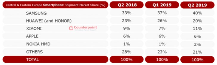 Plutonul e completat de Apple pe 4 şi Nokia/HMD pe locul 5. Analiştii afirmă că piaţa Europei Centrale şi de Est este una tradiţional stabilă, care nu e predispusă la prea mari schimbări. Ordinea actuală: Samsung, Huawei, Xiaomi se menţine de peste 12 luni. Samsung continuă să crească, pe măsură ce Huawei pierde teren, din cauza interdicţiilor impuse de SUA.